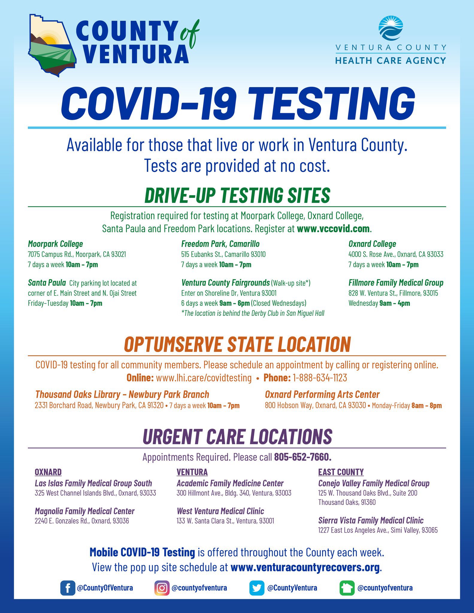County Of Ventura On Twitter Covid 19 Testing Schedule Https T Co K03hjggrad Pop Ups Also At Sarzotti Park Ojai 510 Park Rd 10 4 Conejo Creek South Soccer Fields Thousand Oaks 1300 E Janss Rd 9 3 30